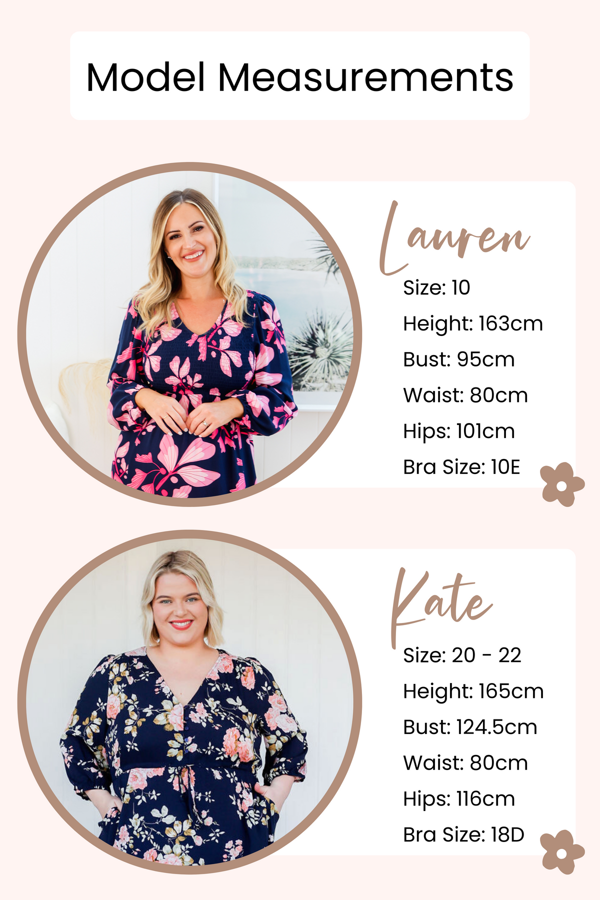 Here’s a list of our models measurements so that you can have a better guide to the fit of each of our items.
